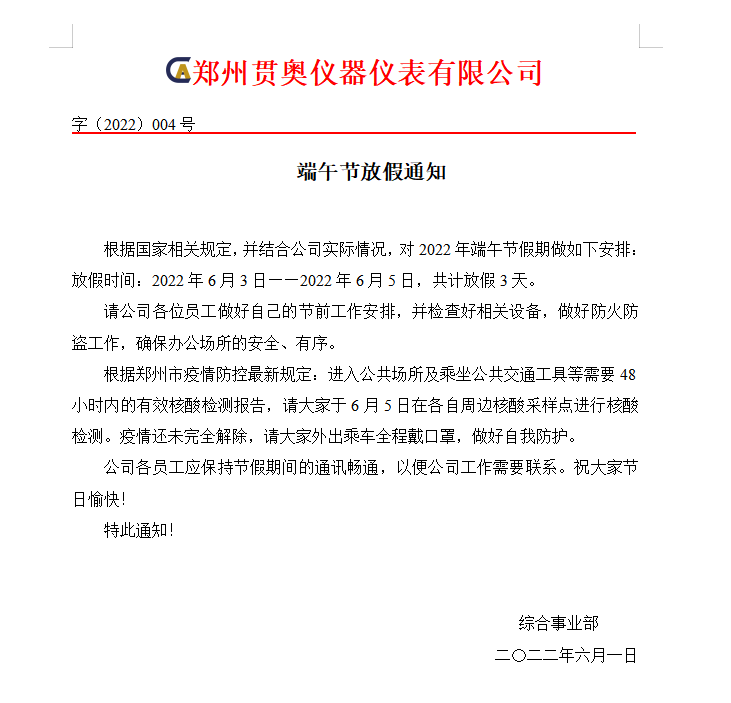 鄭州貫奧儀器儀表2022年端午節(jié)放假通知