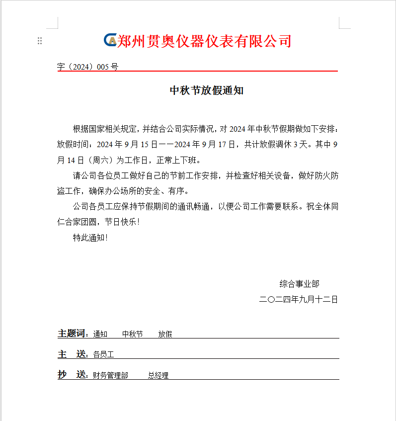 鄭州貫奧儀器儀表有限公司中秋放假通知